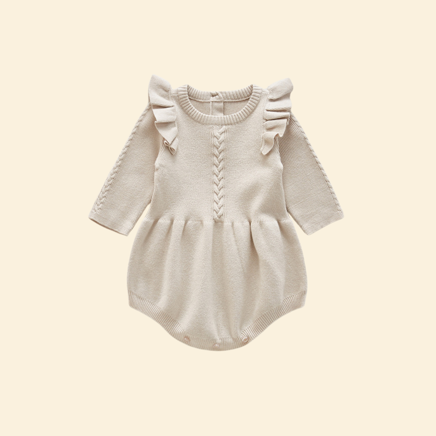 Long sleeves offer a warm embrace without weight, and a classic round neckline adds timeless charm. The dress flows into a sweet A-line silhouette that allows natural movement, making it ideal for twirling, crawling, or quiet moments at home.