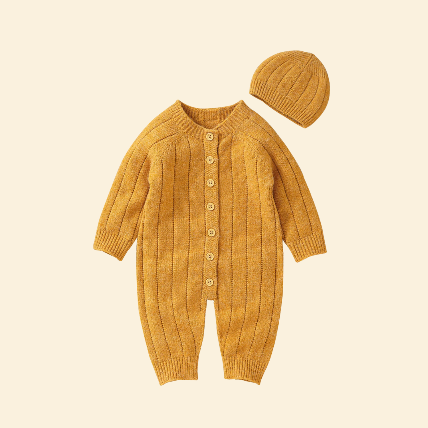 The romper features long sleeves to protect from cool drafts, while the matching hat ties everything together, literally and visually, offering warmth for the head and extra cuteness for your photos. Snap-button closures at the crotch make diaper changes easier than ever, and the ribbed knit edges add a refined touch that resists wear.