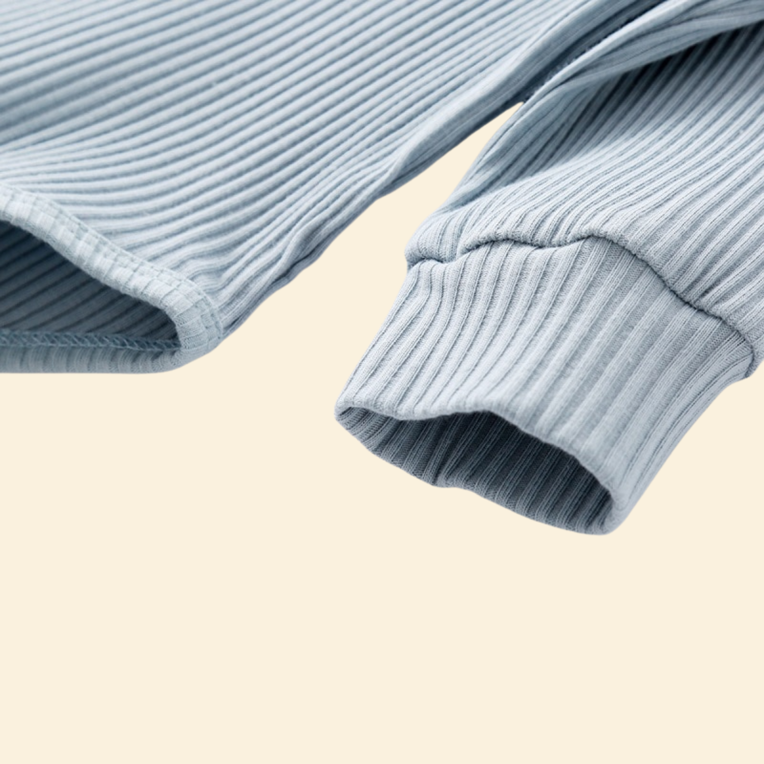 The outfit features a corduroy pattern, lending it a textured look that elevates its “cute” charm while keeping the overall feel warm and friendly. Fastenings are practical: it has crotch press studs so diaper changes are easier without disrupting the baby’s comfort.