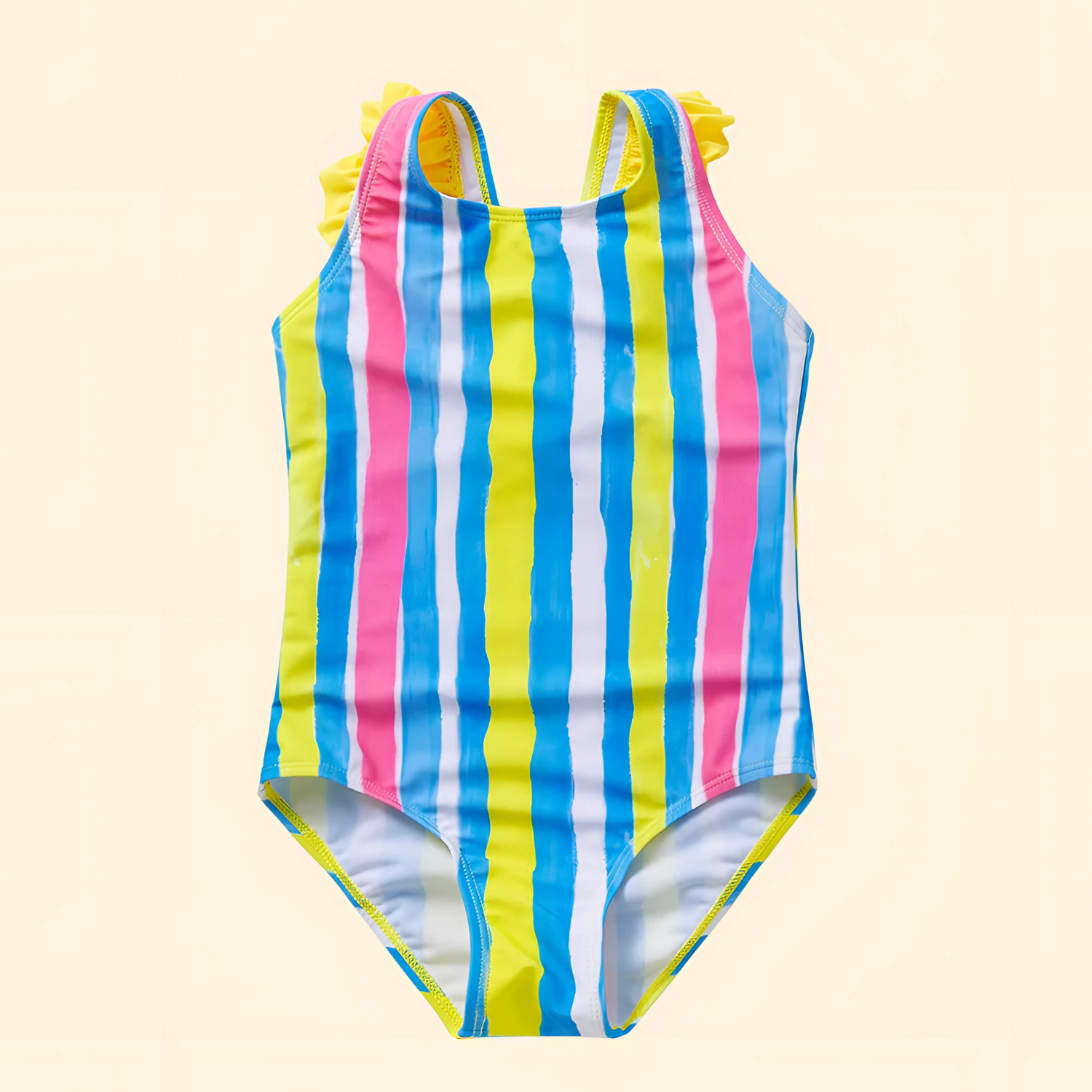 This Colored Stripe Swimsuit brings a splash of modern charm to swimwear, designed to delight parents and little ones alike. With its bold, playful stripes in complementary hues, this one-piece exudes a youthful elegance perfect for girls aged 2 to 8 years who love to stand out with refined style.