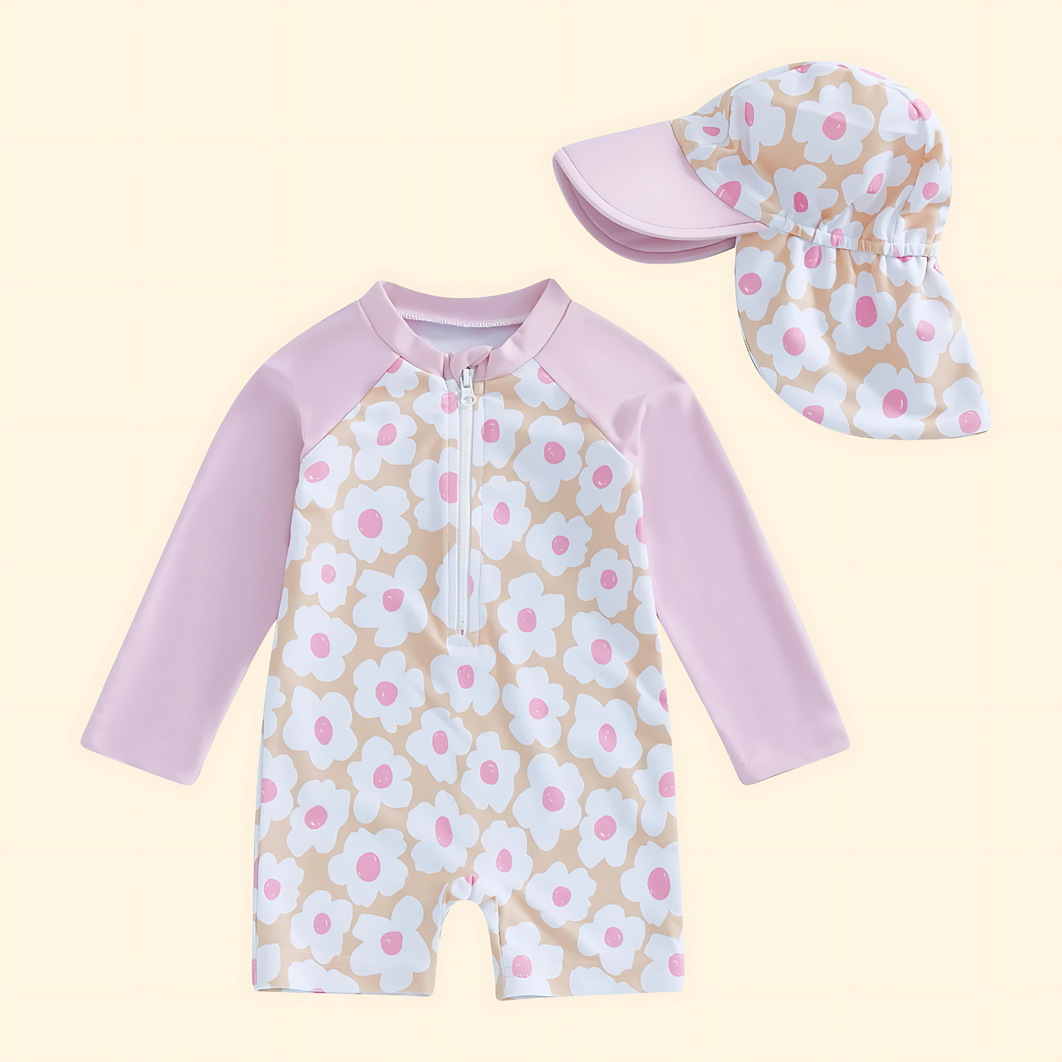 Effortlessly blending thoughtful coverage, coordinated design, and everyday ease, this swimsuit and sunhat set is a perfect pick for playful days in the sun ensuring your little one looks delightful and stays protected no matter the adventure.