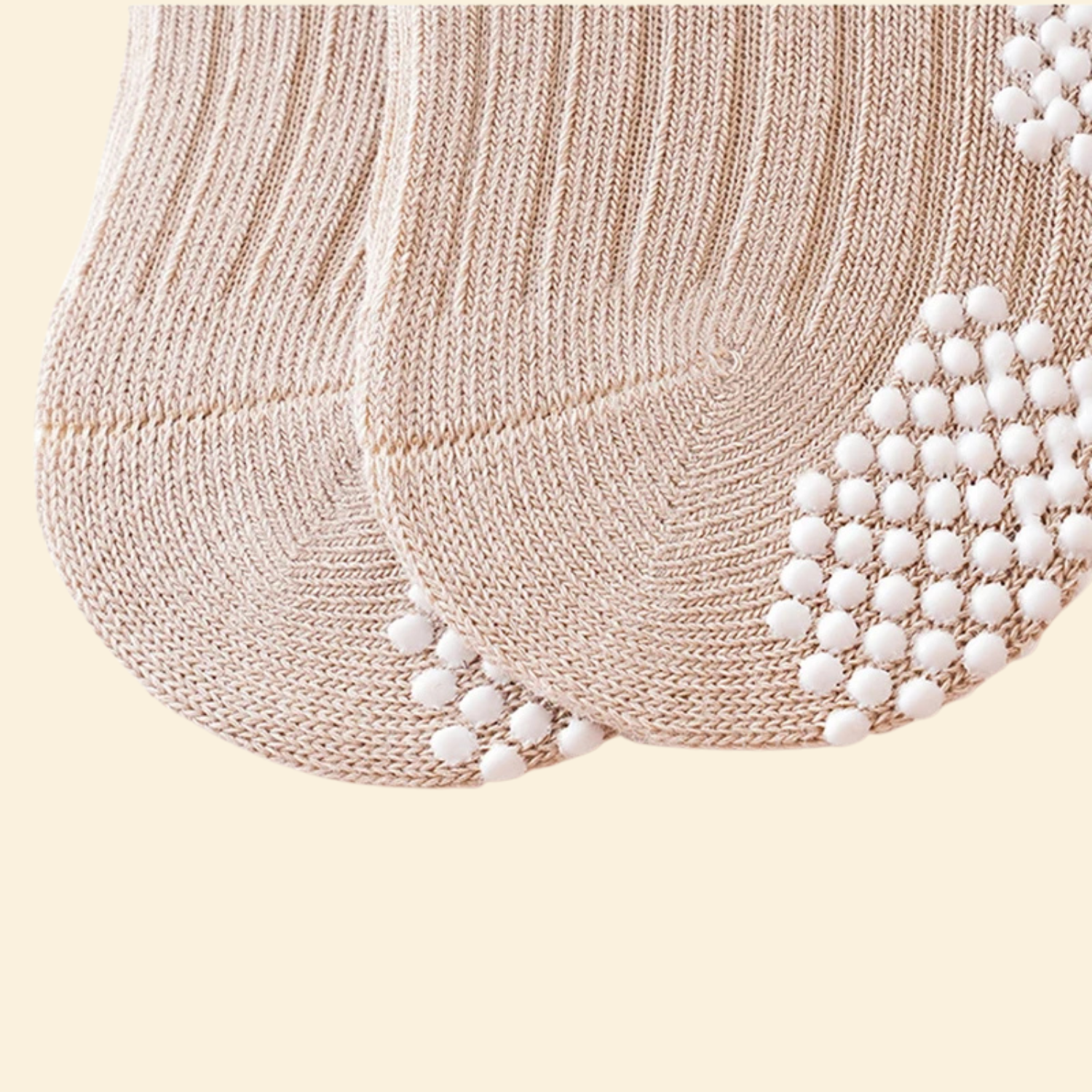 Each set includes five pairs of socks made from a comfortable blend of 95% cotton and 5% spandex, offering breathability with gentle elasticity that holds the socks in place. Thoughtfully finished with anti-slip grips on the sole, they help prevent slips on smooth floors—perfect for early walkers and energetic playtimes.